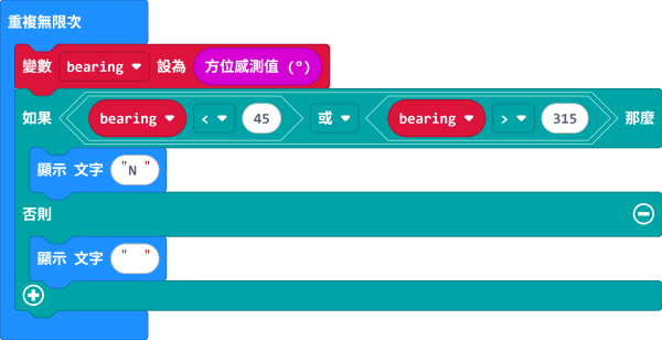 目錄表 簡單輸出/入練習 程式結構 罐頭效果 猜拳 光感應器 光感應-伺服馬達指針 光感應-指針程式 指北針 指北針-校準 指北針-角度 指北針-程式 磁力感測 彩虹燈 聲音儀表 音樂編輯 計數器/測距輪 小車控制 避障車 簡單輸出/入練習 程式結構 罐頭效果 猜拳 光感應器 光感應-伺服馬達指針 光感應-指針程式 指北針 指北針-校準 第一次使用羅盤,你得校正它 首次使用micro:bit指南針時,必須先校準。 螢幕上會出現一個小遊戲,您必須傾斜micro:bit點亮每個LED,接著就可以開始使用了。 指北針-角度 指北針-程式 磁力感測 彩虹燈 聲音儀表 音樂編輯 計數器/測距輪 小車控制 避障車